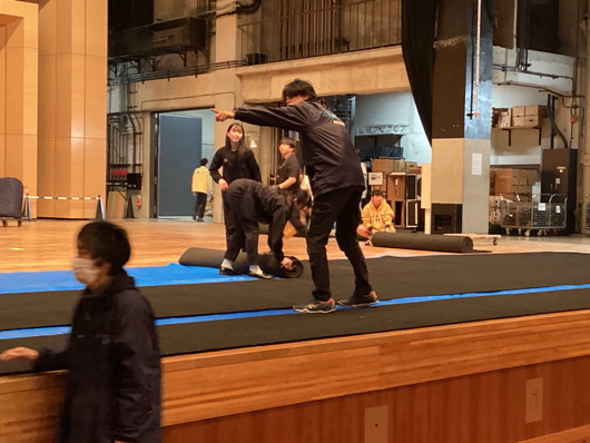 本日は午後から探究学習[福祉探究]の特別講義として、東京演劇集団風によるヘレン・ケラーを鑑賞します。午前中は有志ボランティアスタッフ(2年生から6年生)が、劇団スタッフと舞台の組み上げを行なっています。探究活動で大事なのは行動!頑張っています!