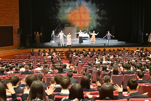 今回の演劇は【生徒が主体的に参加する】企画であり【当事者感】をもって鑑賞するために事前学習も行いました。その甲斐もあってクライマックスでは出演者と一緒に指文字(アルファベット)でケラーの想いを一緒に伝えたり、エンディングで合唱することができました。本日の探究学習を通じて、開星のみんなの心に変容が起きる気がします。