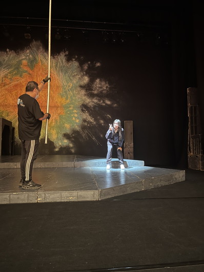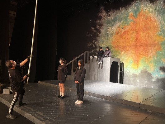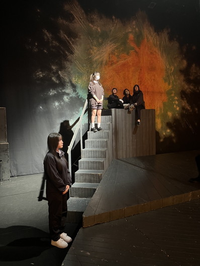 舞台を組み上げた後は、照明の調節です。もちろんモデルは生徒ボランティア!