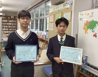 カンボジアから来ているヴィサールさんの「クメール語」と、ラオスから来ているキンさんの「ラオ語」は、少し似ているところもあります。図書館に展示してある他の留学生の作品を見ながら、地域と言語についての話を聞かせてくれました。