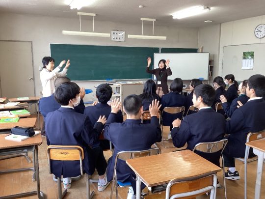 最初に読み聞かせと手遊びを体験し、それからペアになって読み聞かせの実践です。子どもたちから見えやすいように絵本の持ち方を工夫したり、聞き取りやすい声の大きさや読む速さにも気をつけました。いつも弟や妹に読み聞かせをしているという生徒の活躍も見られました!