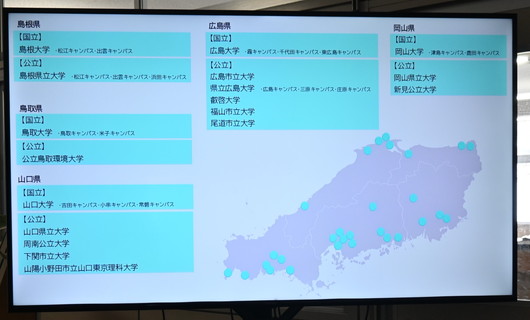 第1弾として、キャリアセンター前の廊下にモニターを設置し、中国地方の国公立大学の紹介を映しています。