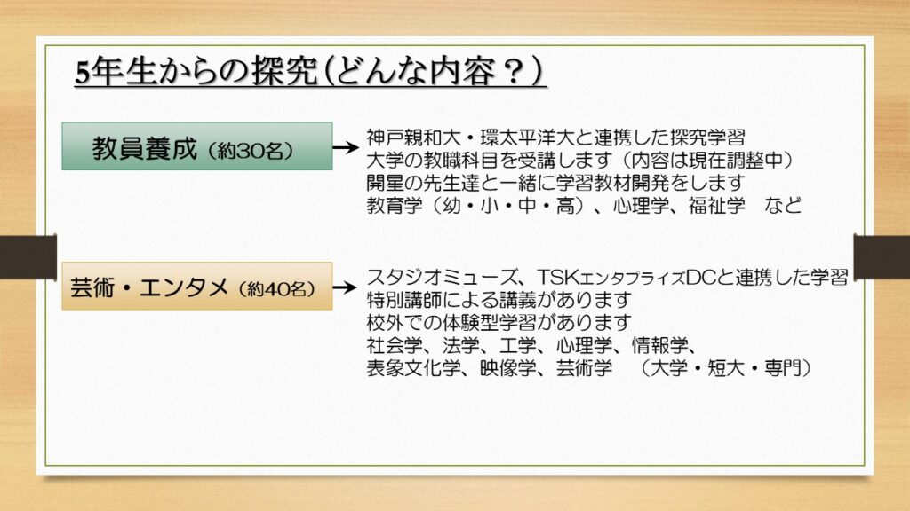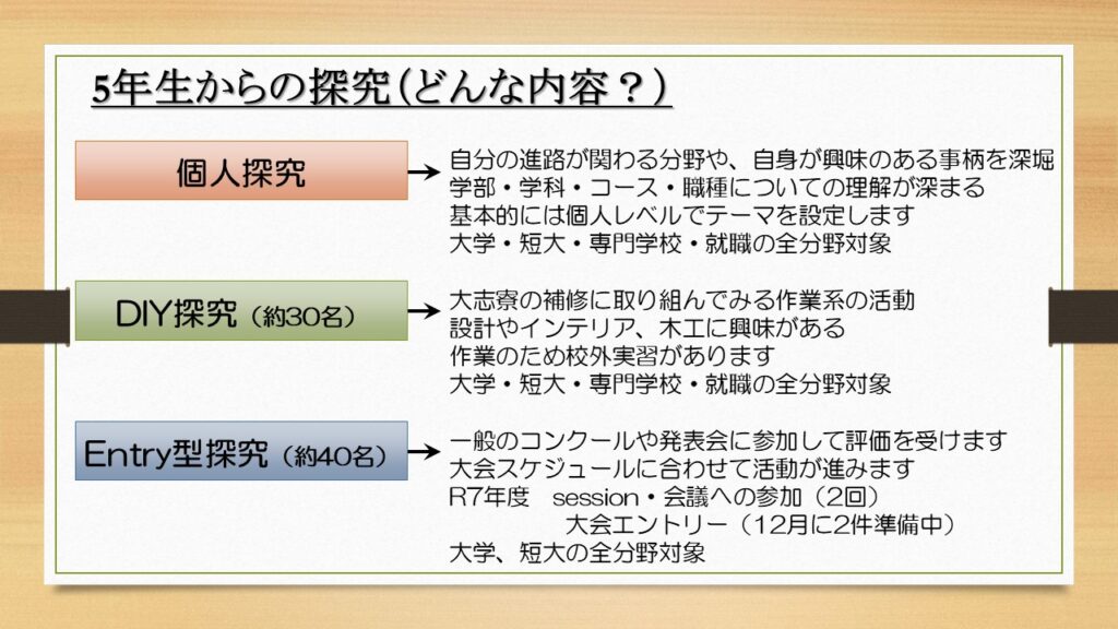 次年度の探究活動は、個人研究・DIY探究・Entry探究・教員養成・芸術エンタメの5つのコースに分かれ、それぞれが異なる学びのスタイルや目的に応じて設計されています。、どのコースにおいても「自分で課題を見つけ、深く考え、行動する」ことを大切にしており、生徒一人ひとりが主体性を発揮できるよう工夫が施されています。