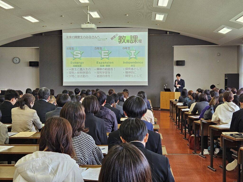 令和8年度は、開星中学校からの内部進学生を含め、223名の新たな仲間を本校にお迎えすることとなりました。数ある選択肢の中から、本校を選んでくださったことを教職員一同、心より嬉しく思っております。