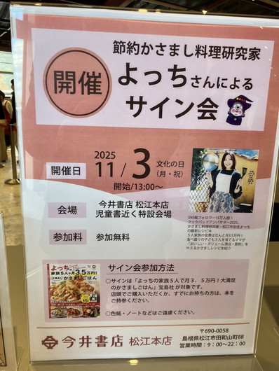 昨日、本校の卒業生で、現在は「節約かさまし料理研究家」として大活躍中の よっちさん(開星アンバサダー) のサイン会が、今井書店松江本店で開催されました!
