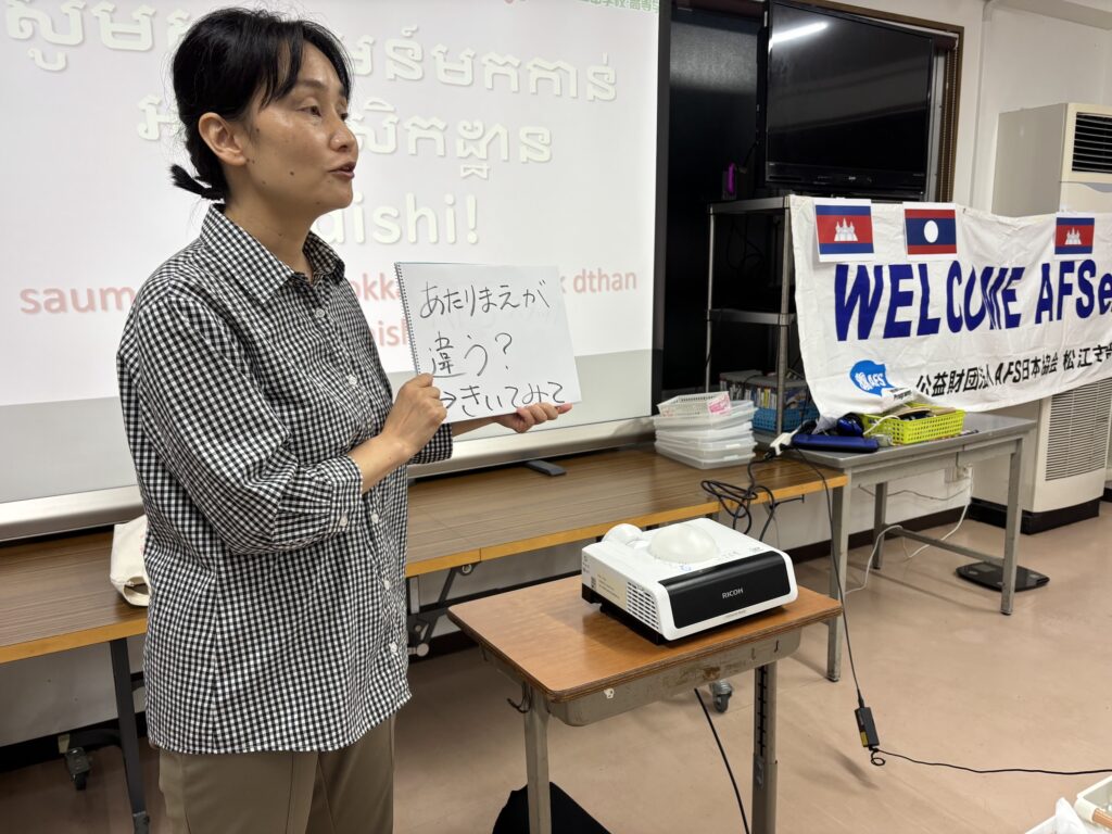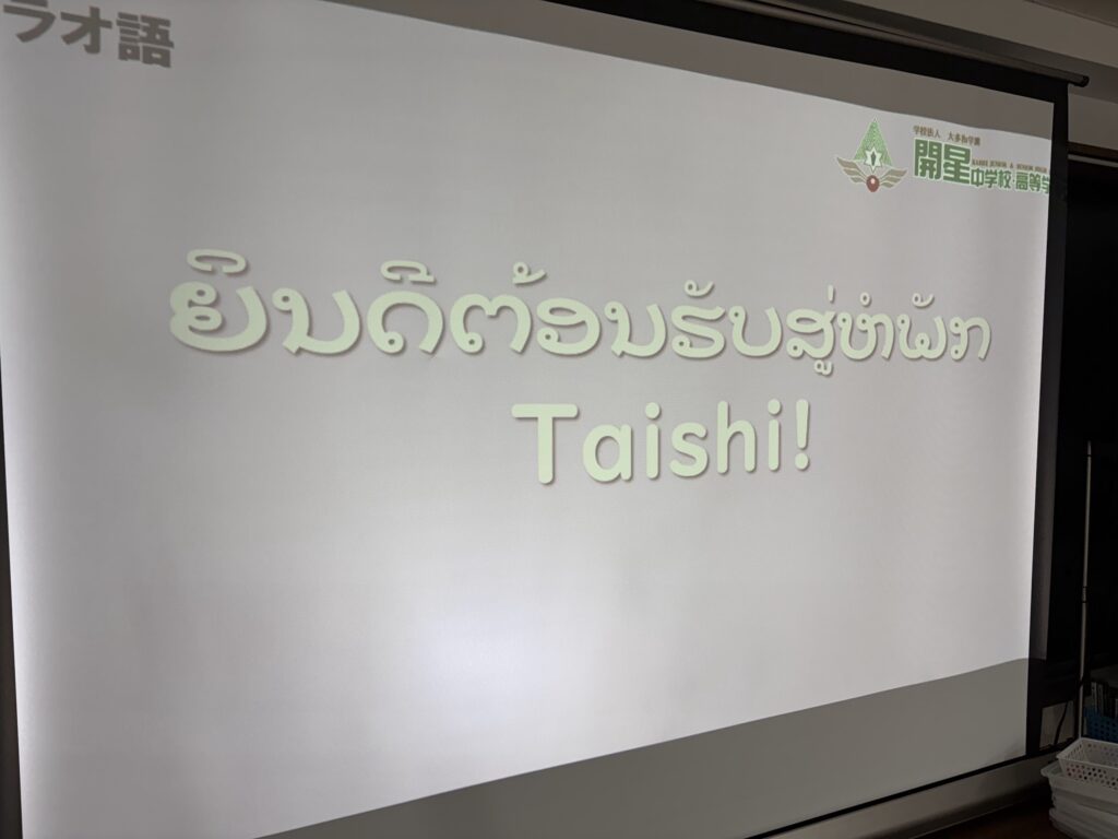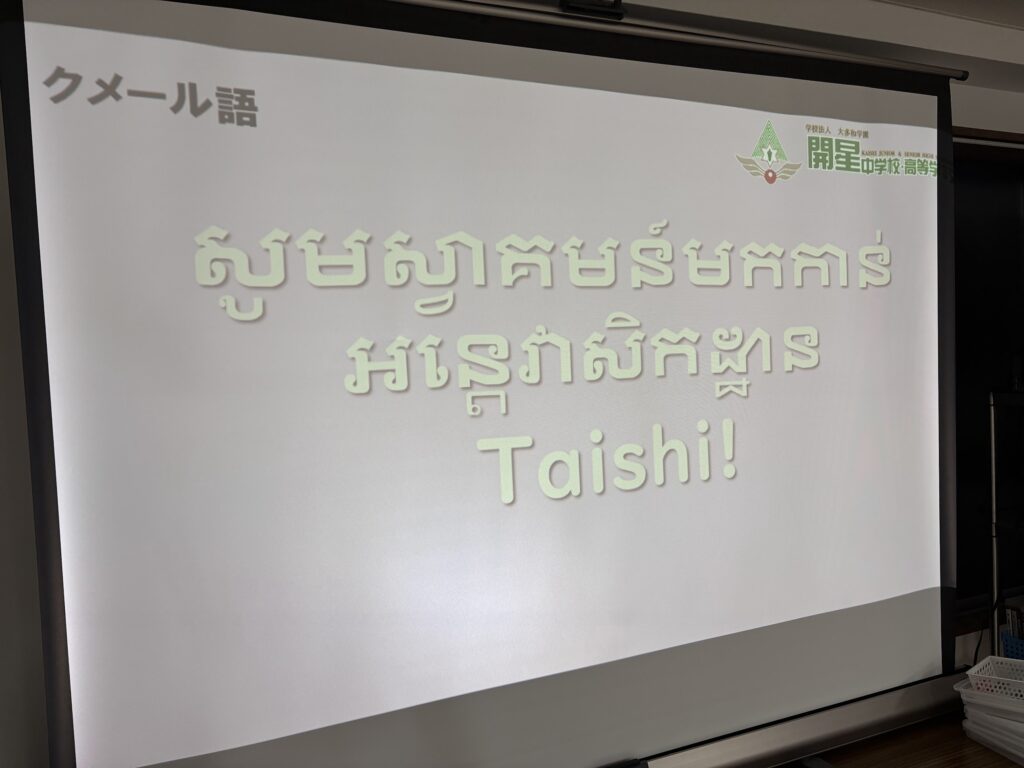 18時30分からはウェルカム会を開催し、大月先生によるレクチャーを受けた後、母国語であるカンボジア語・ラオス語で「こんにちは」「ありがとう」といった挨拶を練習しました。最初は少し緊張していた様子でしたが、すぐに大志寮の仲間たちと打ち解け、笑顔あふれる交流の場となりました。