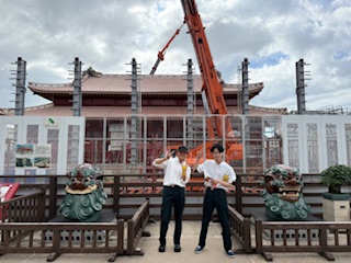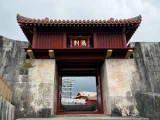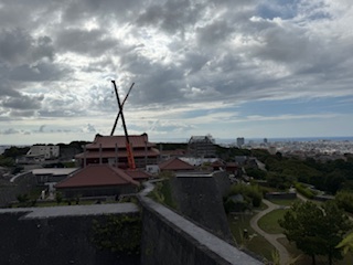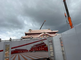 2019年10月31日の火災で主要施設が消失した後で、正殿復元整備工事中でしたが、来年秋の完成に向けて雨や風から守る仮設の覆い「素屋根」や骨組みが取り払われて、正殿の全貌を観ることが出来ました。ラッキーでしたね。