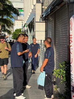 夕食までの時間を、部屋で過ごす人や国際通りで自由散策に出かける人など、生徒たちは思い思いの時間を過ごしています。今日も一日沖縄は暑かったですね。