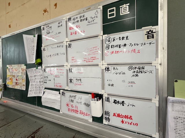 副校長先生にご案内いただき、校内を拝見しました。特にICT機器の活用が印象的で、不登校や別室学習の生徒へのオンライン対応、生徒一人一台端末やデジタルドリルの活用、心の天気や相談機能の導入、生徒見守りデータの整備など、先生方の生徒に寄り添う姿勢が徹底されていることに感銘を受けました。