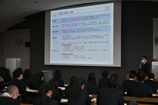 当日は、島根県選挙管理委員会事務局の皆様のご協力により、「島根県における選挙の現状」についてご講話をいただきました。講話では、「選挙は、私たち国民が政治に参加し、主権者として自らの意思を政治に反映させることができる最も重要で基本的な機会です。18歳で選挙権を得ることをきっかけに、選挙や政治に関心をもってほしい。若い世代が住みやすい社会をつくるためには、皆さん一人ひとりの投票が必要です」とのお話がありました。