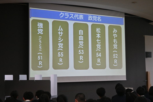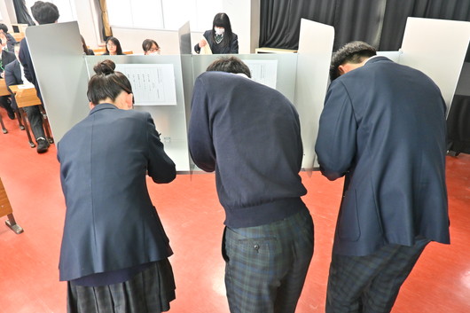 その後、クラス代表による政党プレゼンテーションを行い、松江選挙管理委員会よりお借りした投票箱や記載台を使用して模擬選挙を体験しました。