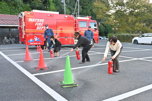さらに、教職員を対象に初期消火対応として消火器の使い方についてもご指導いただき、実際に操作を体験しました。