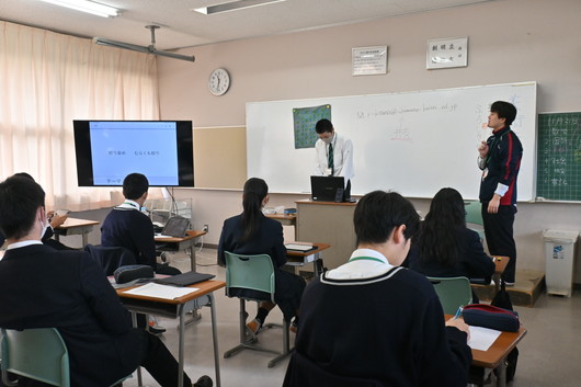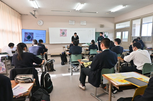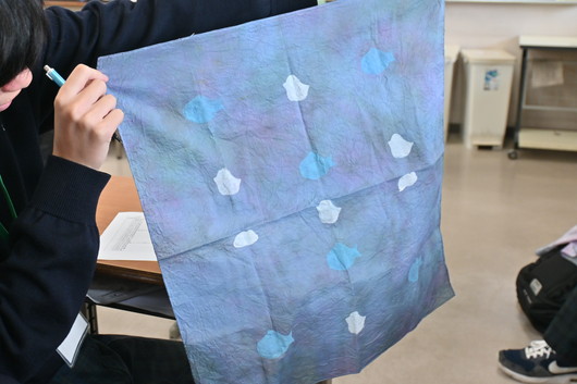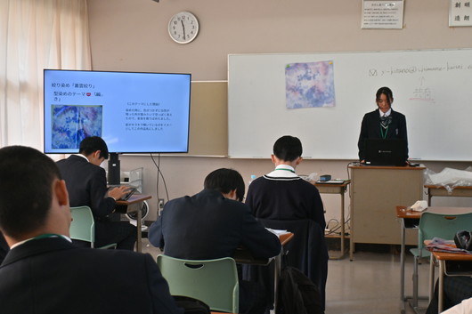 生徒たちは、自分が選んだ絞りや型の種類、デザインのテーマ、そして制作の中で工夫した点などについて、説明しました。