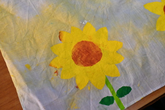中学3年生美術の授業で「絞りと型のふろしき作り」で成果発表会を行いました。