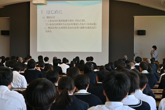 本日は特別講師として、島根県弁護士会の鳥居弁護士をお招きし、「刑法」についてご講義いただきました。講義では、「刑法とは何か」「なぜ刑法が必要なのか」「刑罰にはどのような種類があるのか」といった基本的な内容を、具体的な事例を交えながら分かりやすくお話しいただきました。
