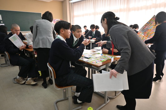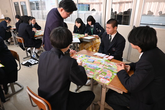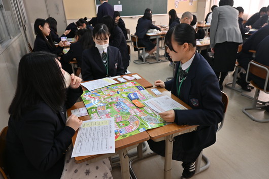 授業では、消費者教育・金融保険教育教材である「ライフサイクルゲームⅢ~生涯設計のススメ~」を活用し、すごろく形式のゲームを通して人生を疑似体験しました。ゲームの中では、結婚や住宅購入、就職といったさまざまなライフイベントに加え、病気やケガといった予期せぬリスク、さらには振り込め詐欺や架空請求などの消費者トラブルにも直面しました。楽しみながら進める中で、お金の管理や保険の役割、将来に備えることの大切さについて主体的に考えることができ、生徒たちにとって実生活に結び付く貴重な学びとなりました。