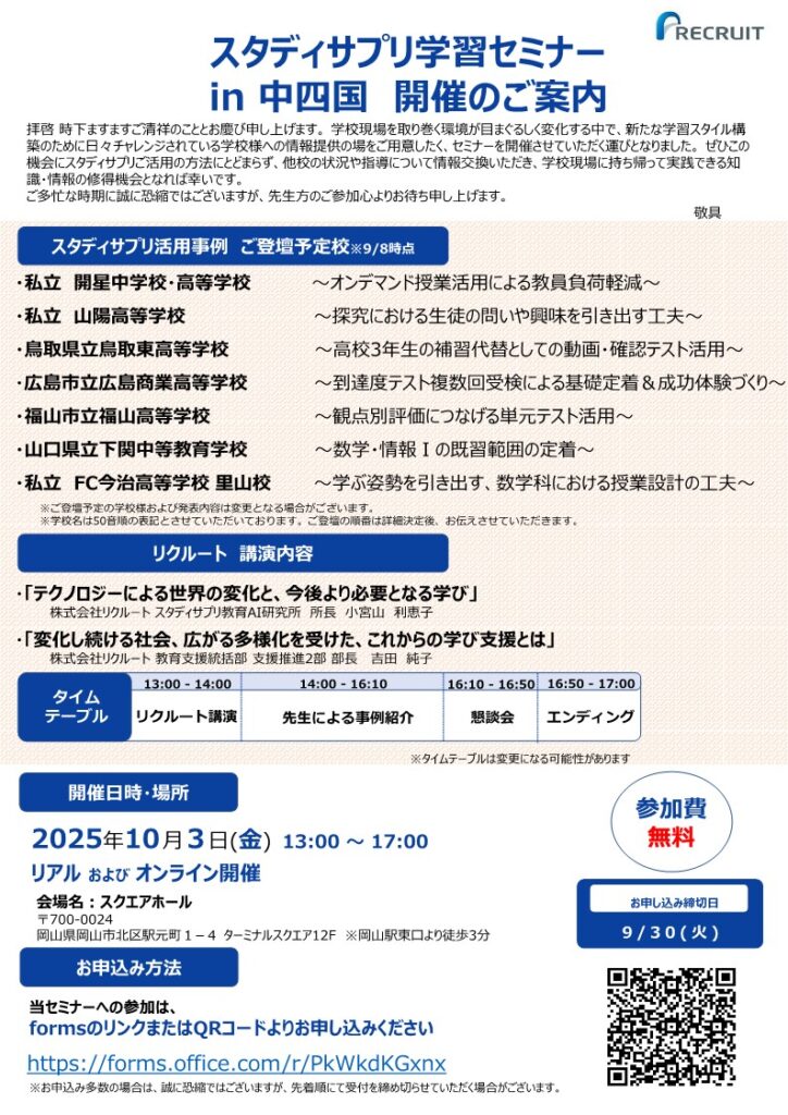 リクルート主催の「スタディサプリ学習セミナーin中四国」が2025年10月3日(金)に開催されます。