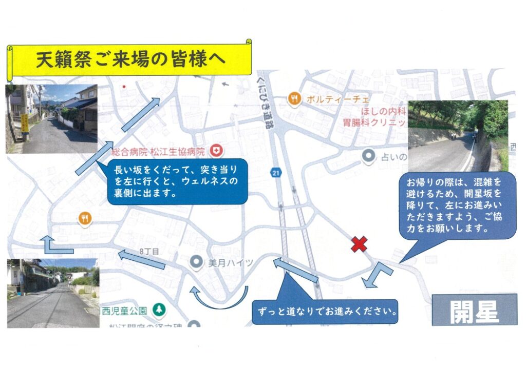 お車でご来場の際は、天籟祭終了後に開星坂を下り、左折していただきますと、周辺道路の交通渋滞の緩和につながります。スムーズな通行に向けて、皆様のご理解とご協力を賜りますようお願い申し上げます。