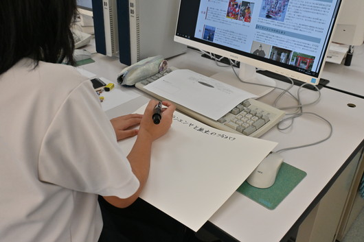 前半は、探究活動の基礎を学ぶレクチャーを受けた後、松江に関する事柄(和菓子や城など)についてインターネットで調査を行いました。