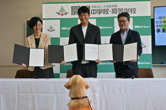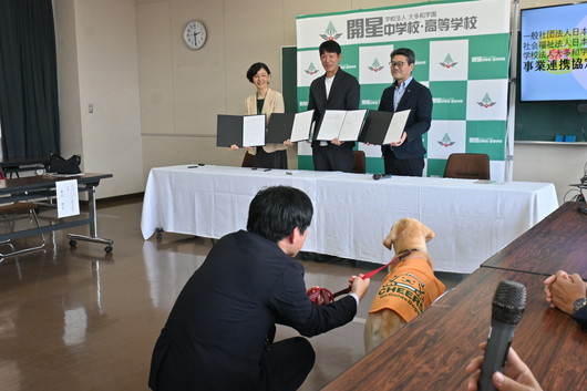 10月8日、学校法人大多和学園 開星中学校・高等学校は、一般社団法人日本スクールドッグ協会と連携協定を締結し、スクールドッグの導入を正式に発表いたしました。同時に、日本スクールドッグ協会と日本ライトハウス盲導犬訓練所による包括連携協定も調印され、盲導犬育成と教育現場を結ぶ新しい取り組みとなります。