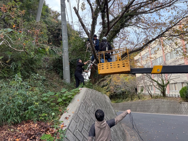 当初はもみの木への設置を試みましたが、高圧線の関係で断念し、学園坂途中の両脇の木にアーチ状に美しく設置していただきました。